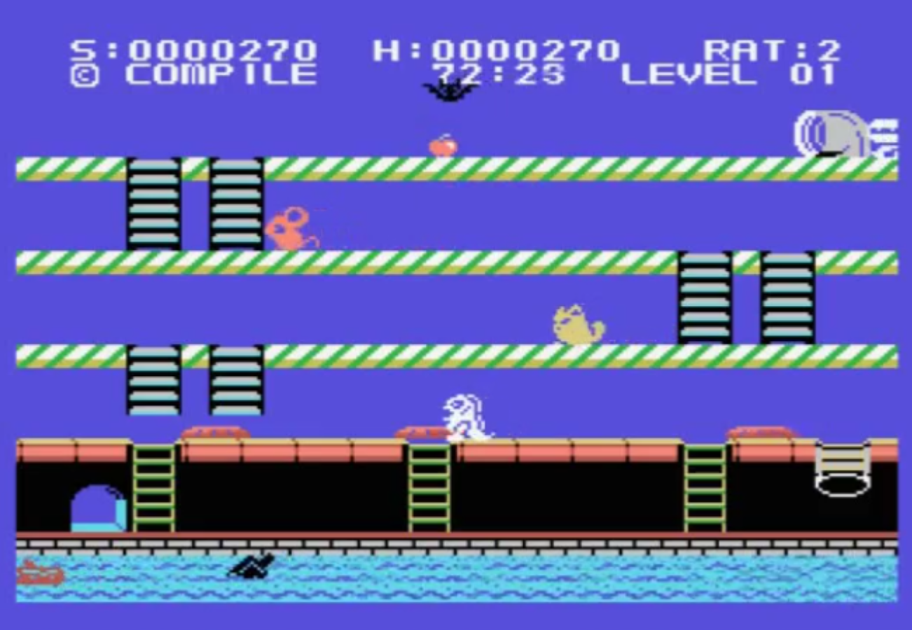 You are Chumy, the mouse. You live in the sewer, and you are very hungry. Luckily, the sewer is filled with cheese, only it is guarded by menacing creatures such as rabbits, turtles and bats. In order to get his cheese, Chumy must go between platforms connected by ladders,
