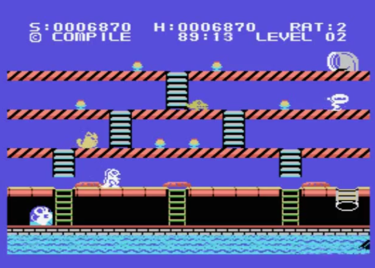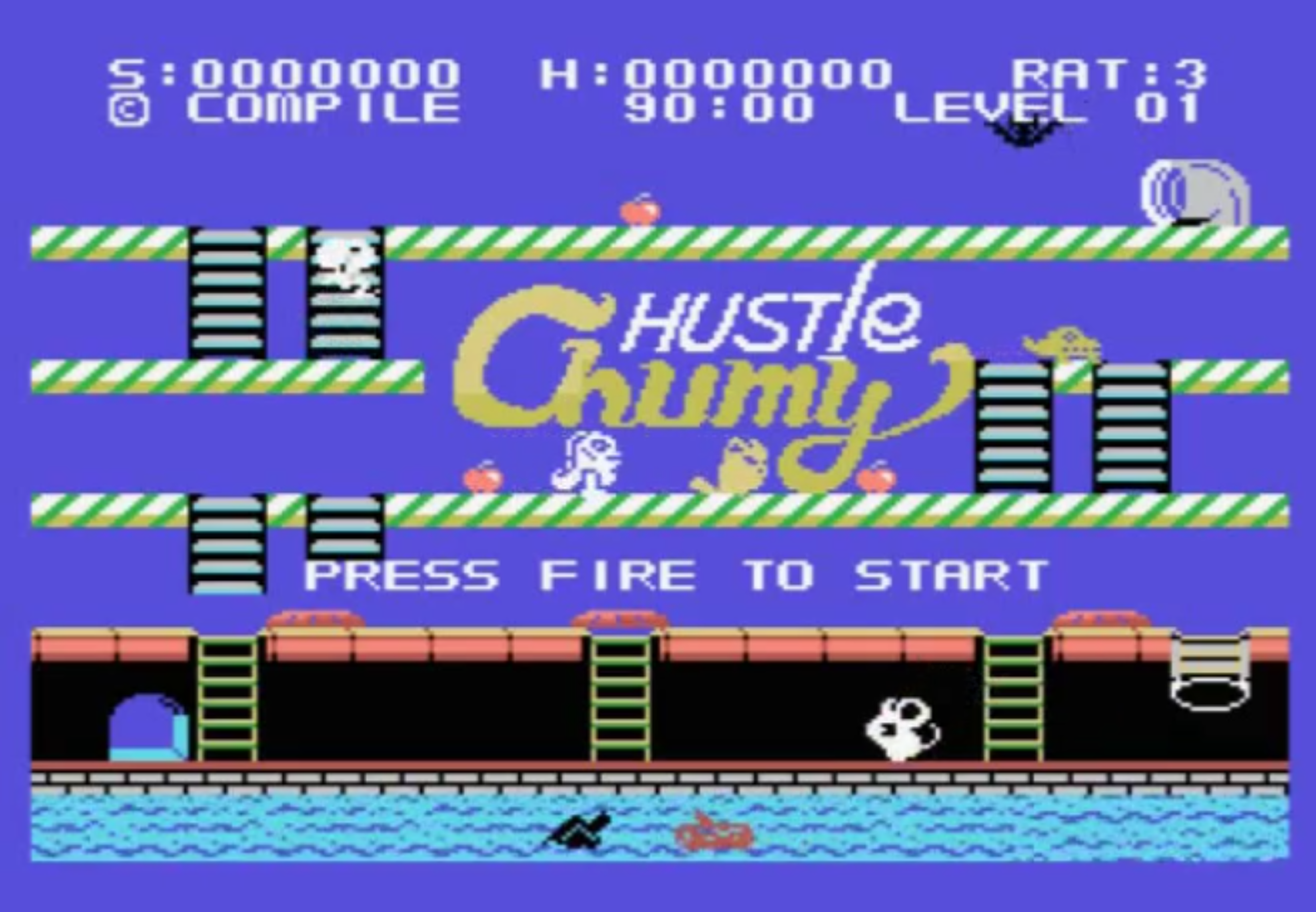 all the time avoiding the other creatures. Luckily, Chumy can jump very far, across and above the nasties. Chumy also has an arsenal of cans to throw at the enemies. Most die after just one hit, whereas others are more impervious to attacks. The rabbits are particularly dangerous, since they may pounce at you unexpectedly, they being able to jump just as far as Chumy. When Chumy eats cheese (or bombs or biscuits), he moves slower due to the extra weight. When the mouse has fed on all the cheese, it can take the dust chute down from the top level to the bottom, and make its way to the exit and on to the next level.