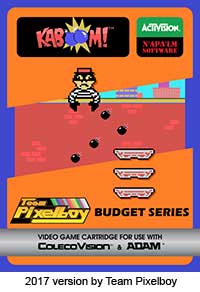 Kaboom! was published in 1981 by Activision for the Atari VCS (renamed to the Atari 2600 in 1982). It was programmed by Larry Kaplan, and David Crane coded the overlaid sprites.
